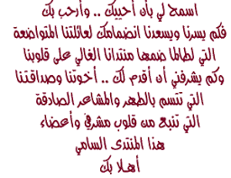 آهـلآ وٍسـهـلآ بكـِْ وٍ بإنظمـآمكَ لبـآقةزٍهوٍرٍنـآإ‘ آلفوٍآحه أمليين بـآن تسعدً بيننـآإ وٍنسسعدبكـِ كـٌل آلتٍرٍآحيبَ وٍآلتحـآيـآإ لآتٌعبرٍ عن مدىآ سرٍوٍرٍنـآإ بآنظمـآمك لنـآإ هآهي أيديـنآإ نمدهـآإ لكَ ترٍحيبـآإ وٍحفـآإوٍهـ آملين أن تقضيْ بصحبتنـآإ ..أسعَد وٍآطيبْ ألآوٍقـآإتَ |