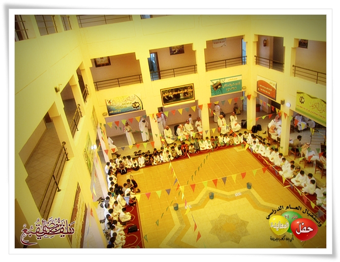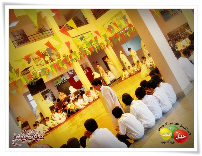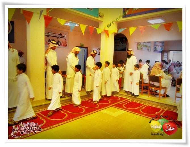 كان موعد لن ينساه طلابنا حيث حفل المعايدة واستقبال الـــعام الدراسي الجديد بدء بالقرآن الكريم ثم كلمة لمدير المدرسة الأستاذ الفاضل خـــالد بن عبد الرحمن الخريف بعدهـا قام طلاب المدرسة بالسلام على معلميهم في جوء أسري وتربوي رائع لينطلق البرنامج الثقافي والألعاب الحركية والمسابقات الذهنية واستمع طلابنا إلى حناجر ذهبية صدعت بأعذب الأناشيد والقصائد ثم تناول أبناءنا وجبة الغداء التي أعدتها المدرسة ليستلم أبنائنا الكتب الدراسية والجدول الدراسي.
