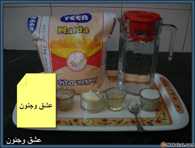 فنجال سكر , ربع ملعقة ملح , نصف فنجال زيت , 3 ملاعق حليب نيدو مجفف , نصف فنجال خميرة , لتر ماء , 2 كيلو طحين أبيض