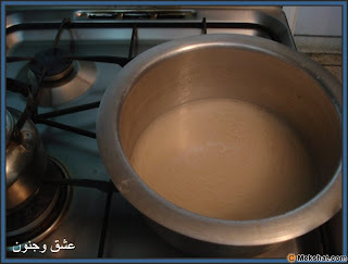 ثم حطينا القدر على النار وحركناة طبعاً مثل ما ذكرت لكم ماء و زيت وسكر وملح وخميرة .