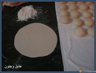 تم تجهيز إثنتان ونبدأ بالثالثة وبعد العجنة الثالثة نحط الصاجة على النار لمدة خمس دقائق حتى تصخن الصاجة