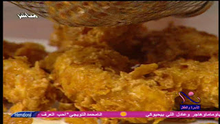 - نأخذ قطع الفراخ ونضعها في الكورن فليكس ونضغط عليها جدا ونقلبها فيه مع الضغط بشدة لتتماسك التتبيلة والغلافة