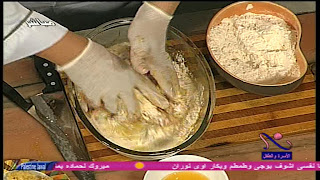- نطلع الفراخ من الثلاجة ونضع عليها شوية دقيق وبيض ولبن ونقلبها جيدا جدا كالعجينة